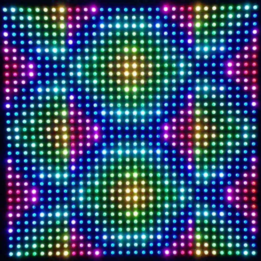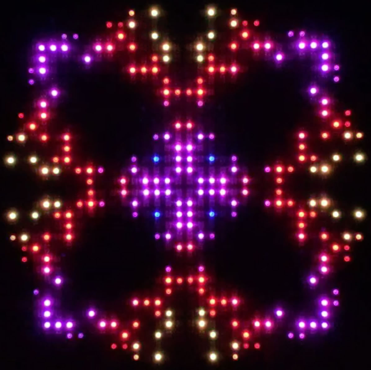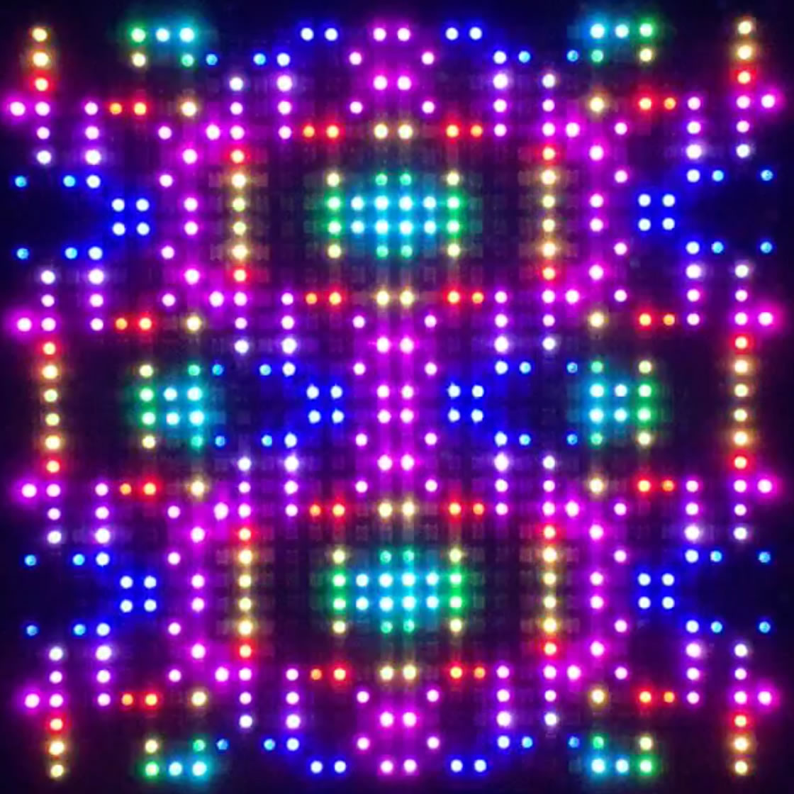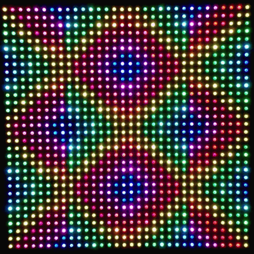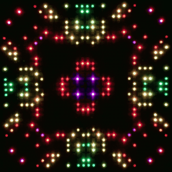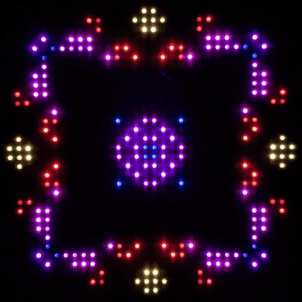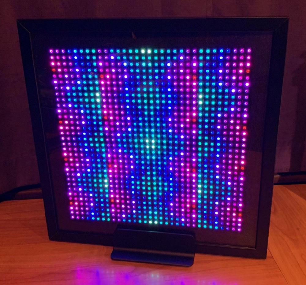 The RGB LED pixels are animated in a variety of hypnotic geometric patterns, many of which are also sound-reactive. The animation mode can be selected with a manual switch on the back of the frame, or with the Enlighted iOS app, which also allows customization of the colors. The frame can be hung on the wall, or held in an optional stand.