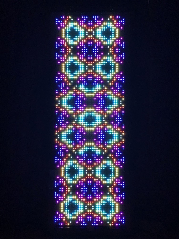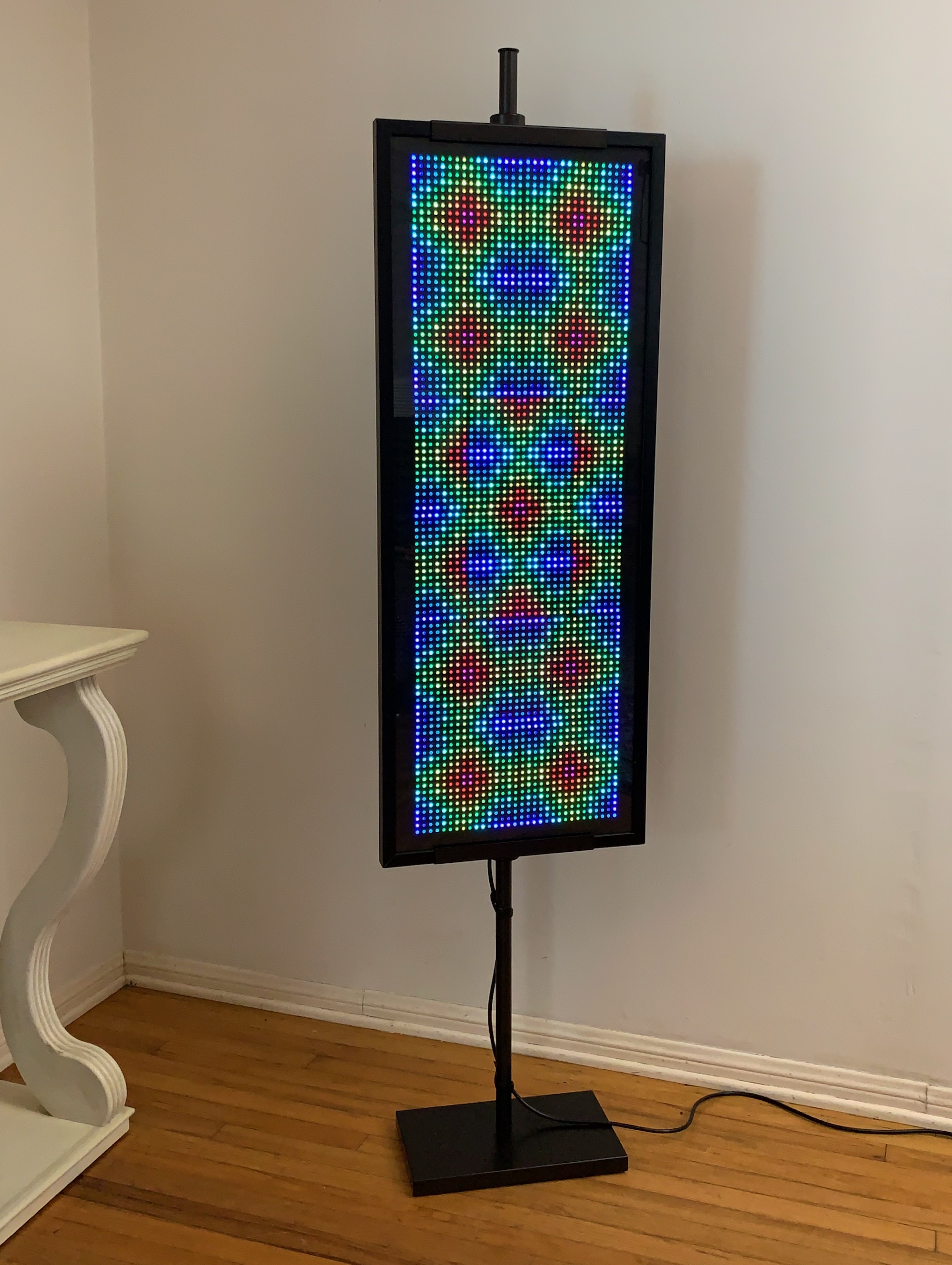 This framed electronic light panel is designed for sitting and staring. It can be used as a visual meditation aid, as decorative mood lighting, or as a part of a music-listening experience.