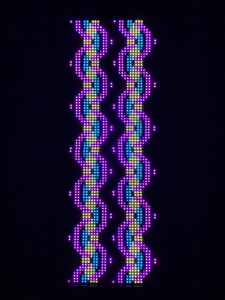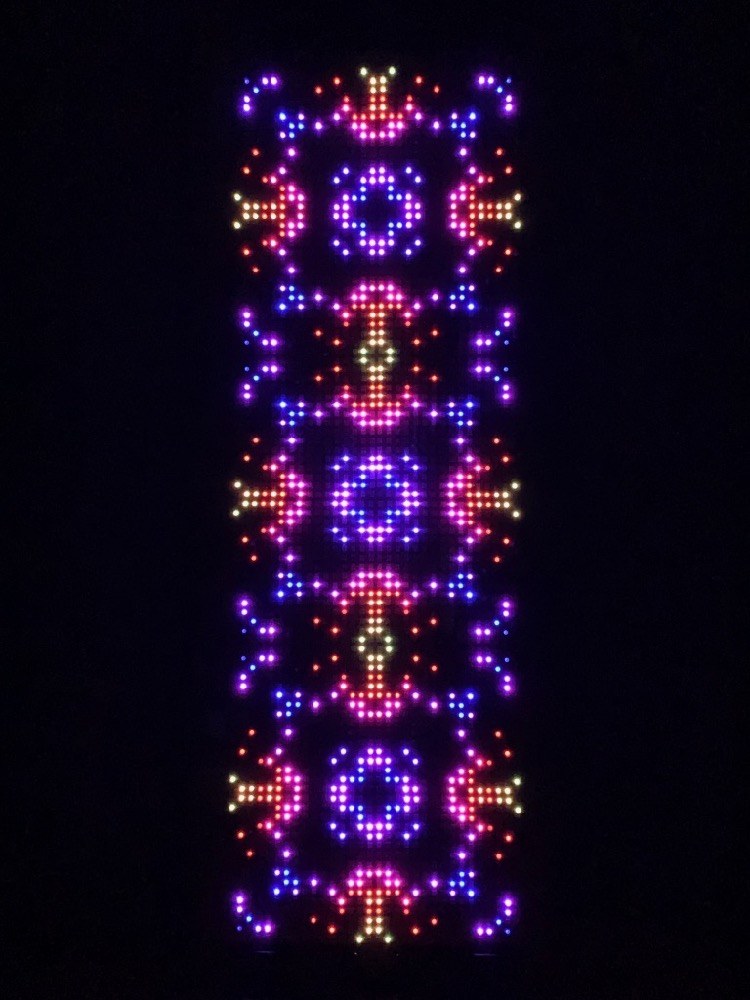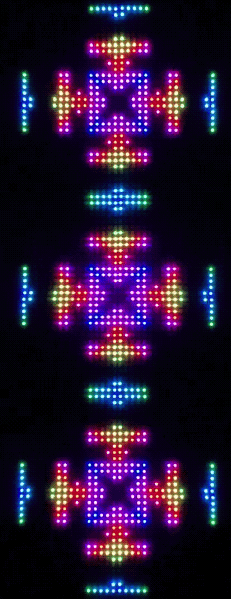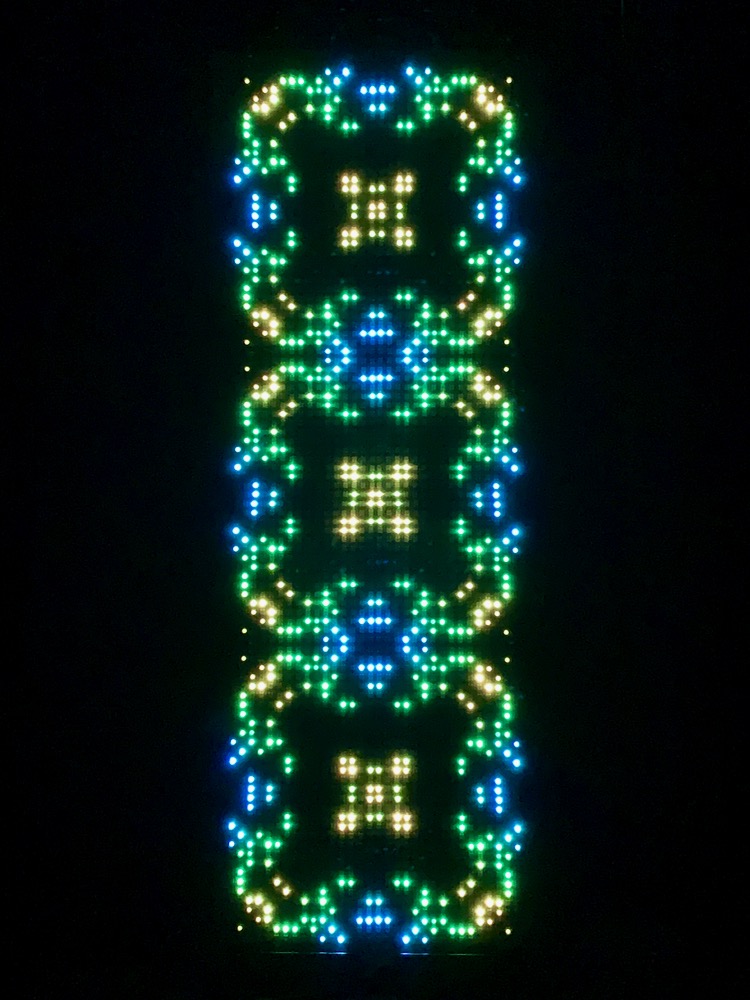 The RGB LED pixels are animated in a variety of hypnotic geometric patterns, many of which are also sound-reactive. The animation mode can be selected with a manual switch on the back of the frame, or with the Enlighted iOS app, which also allows customization of the colors.
