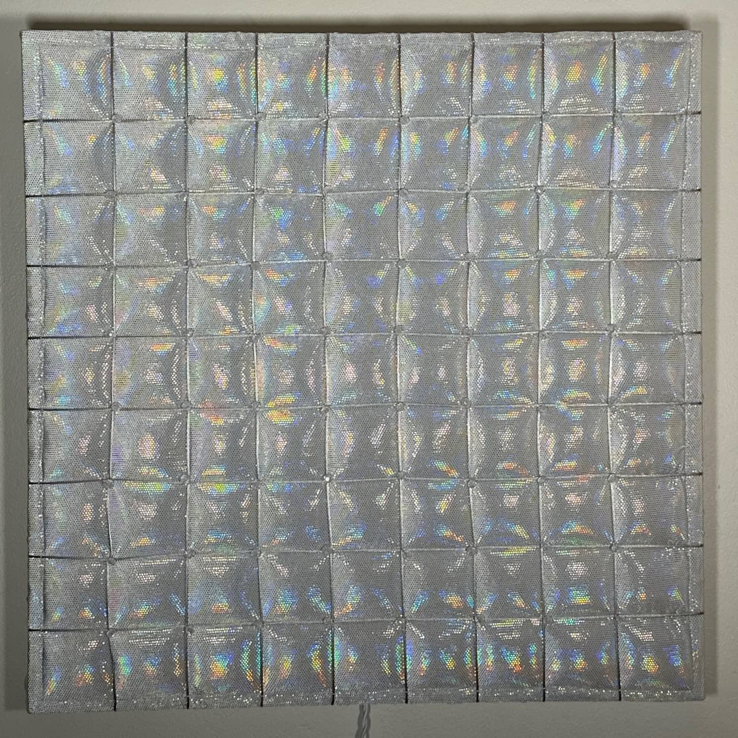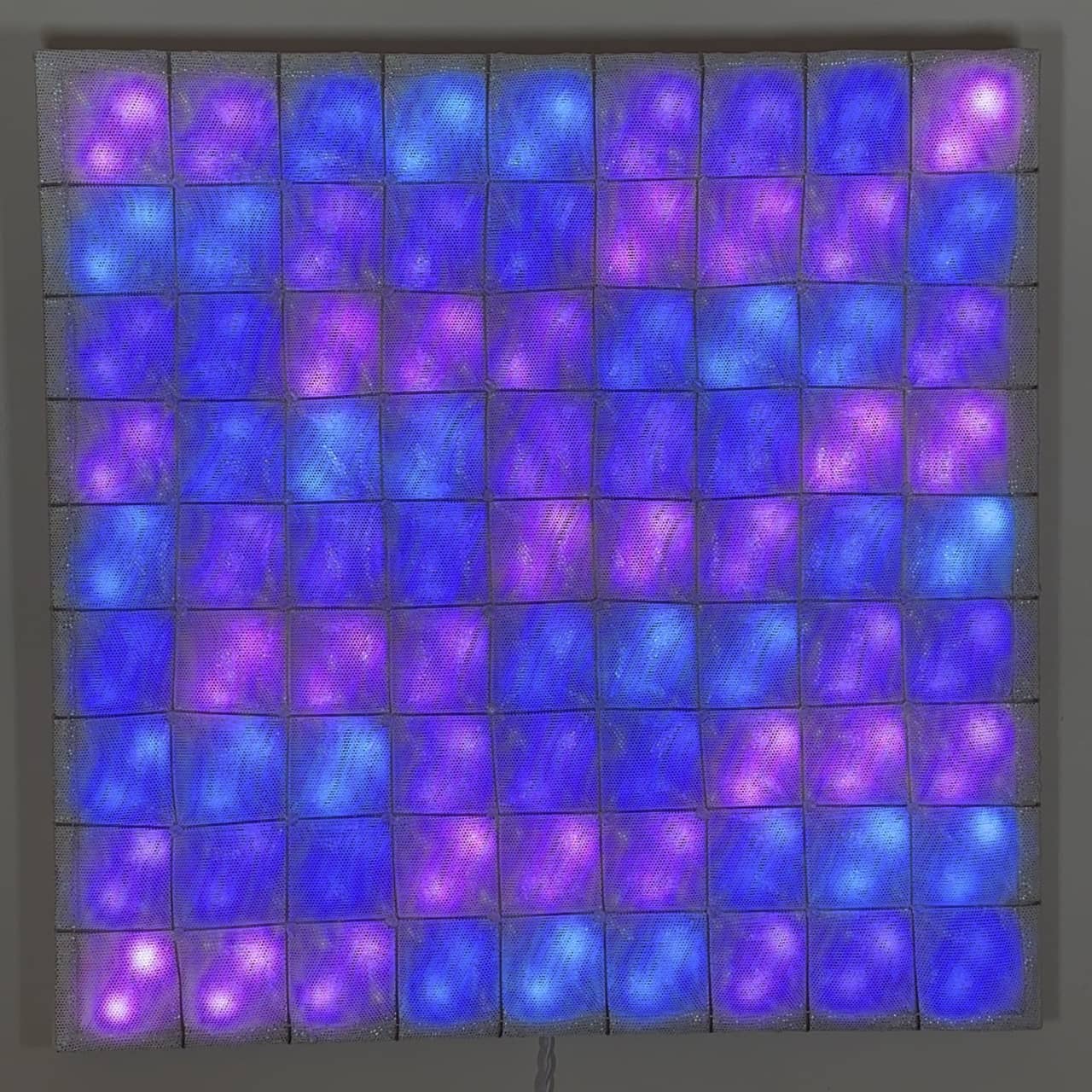 This work uses RGB LED pixels to create vibrant animated light patterns behind a fabric panel with a grid of squares. Light shines through a white velvet fabric with small holographic polka dots that block some of the internal lighting while also reflecting some external lighting (if present). A layer of polyester behind the fabric adds thickness while also diffusing the internal lighting.