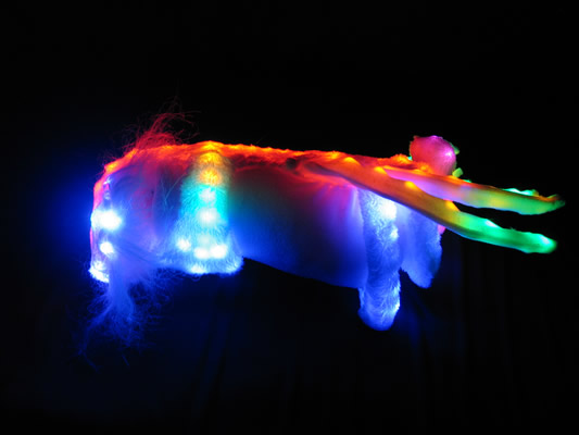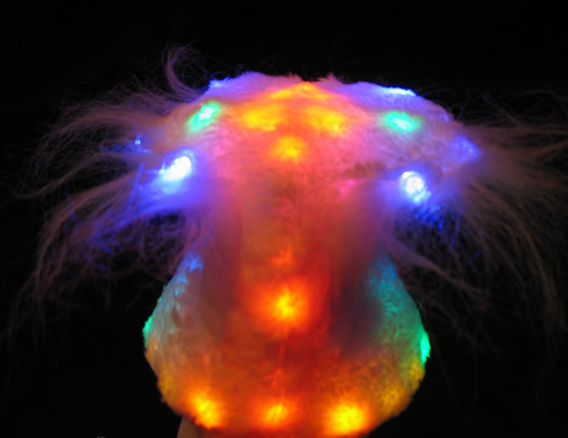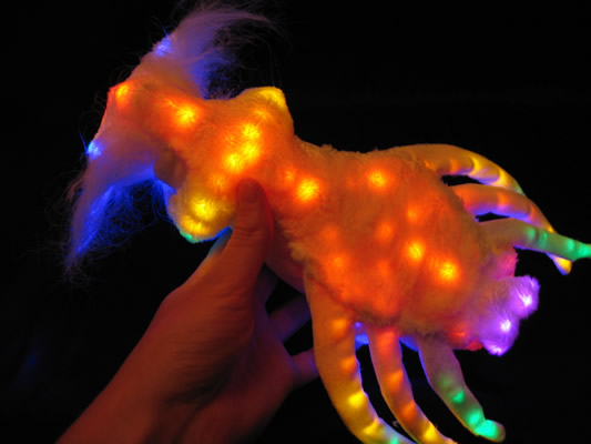 Imagine a found object, of alien origin. Its shape resembles a creature, but it is also soft, cuddly, and blinking in a variety of complicated patterns. Is it a child's plush toy, from another galaxy? Or is it a live being? Or both?