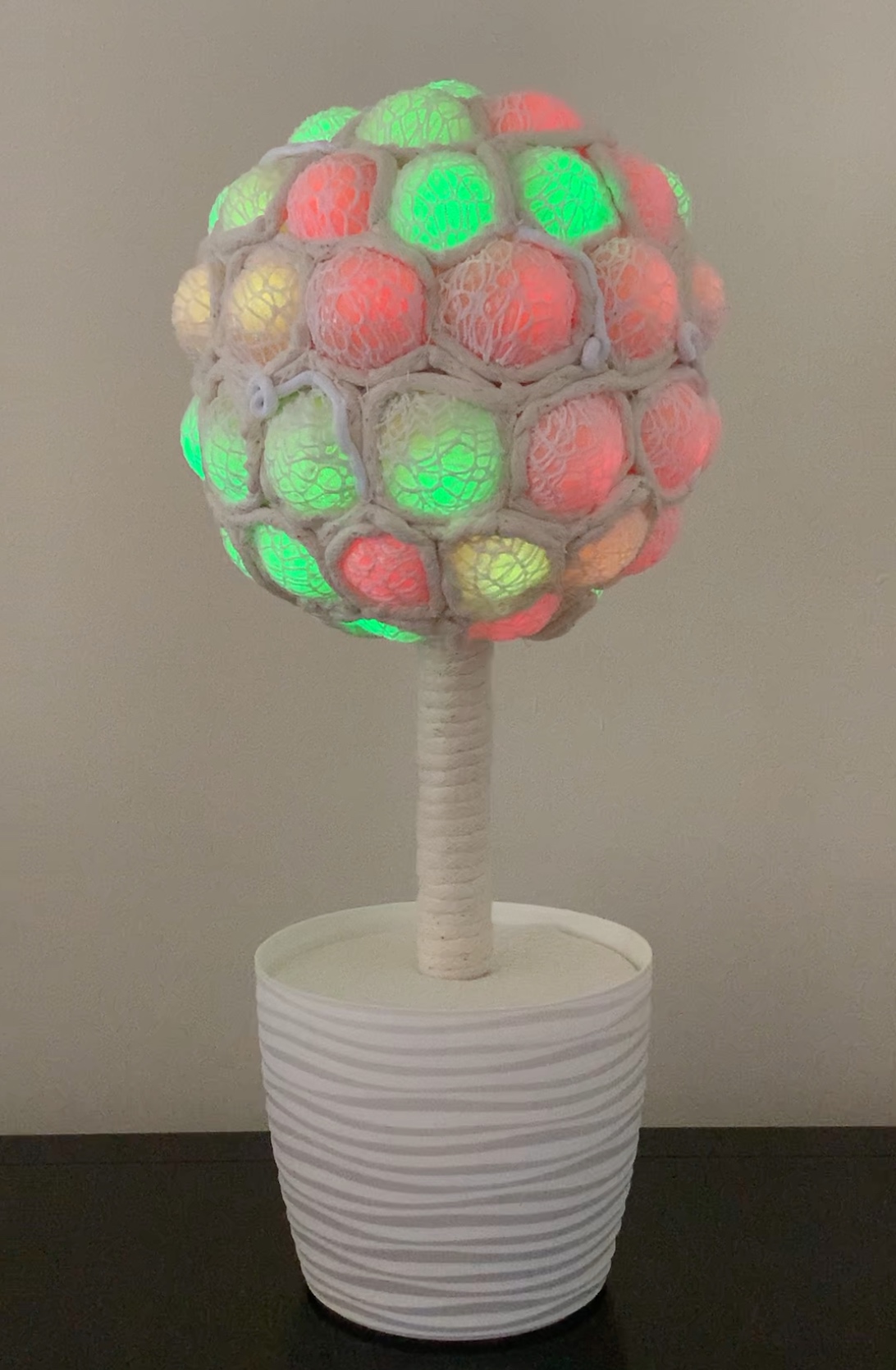 It is intended to mimic a potted plant or small tree, with a vertical trunk topped by a sphere, which is then covered by smaller foam hemispheres. The outer surface is covered with a few types of mesh materials, and the boundaries are filled in with a few types of rope, following a somewhat irregular pattern to suggest that it is a growing organic material.