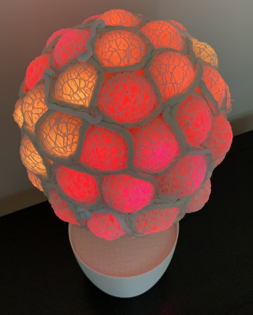 The light from each pixel illuminates a single piece of foam, so that light does not mix between neighboring pixels. It is illuminated with animation patterns that use mostly red, orange, and green, so that the individual regions sometimes resemble fruits with differing degrees of ripeness. Changes in brightness also contribute to a throbbing illusion, where the individual bumps appear to be growing and shrinking.