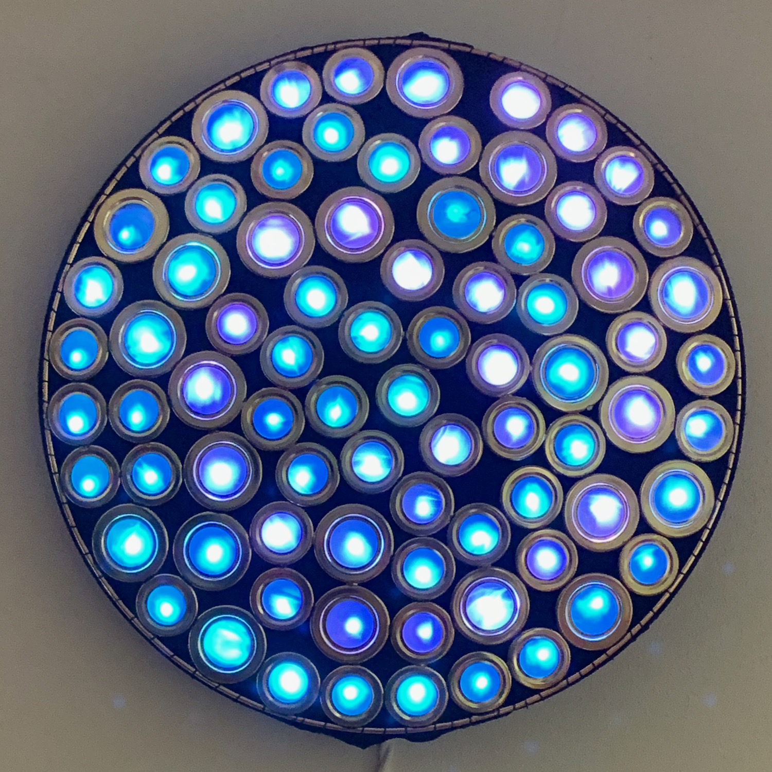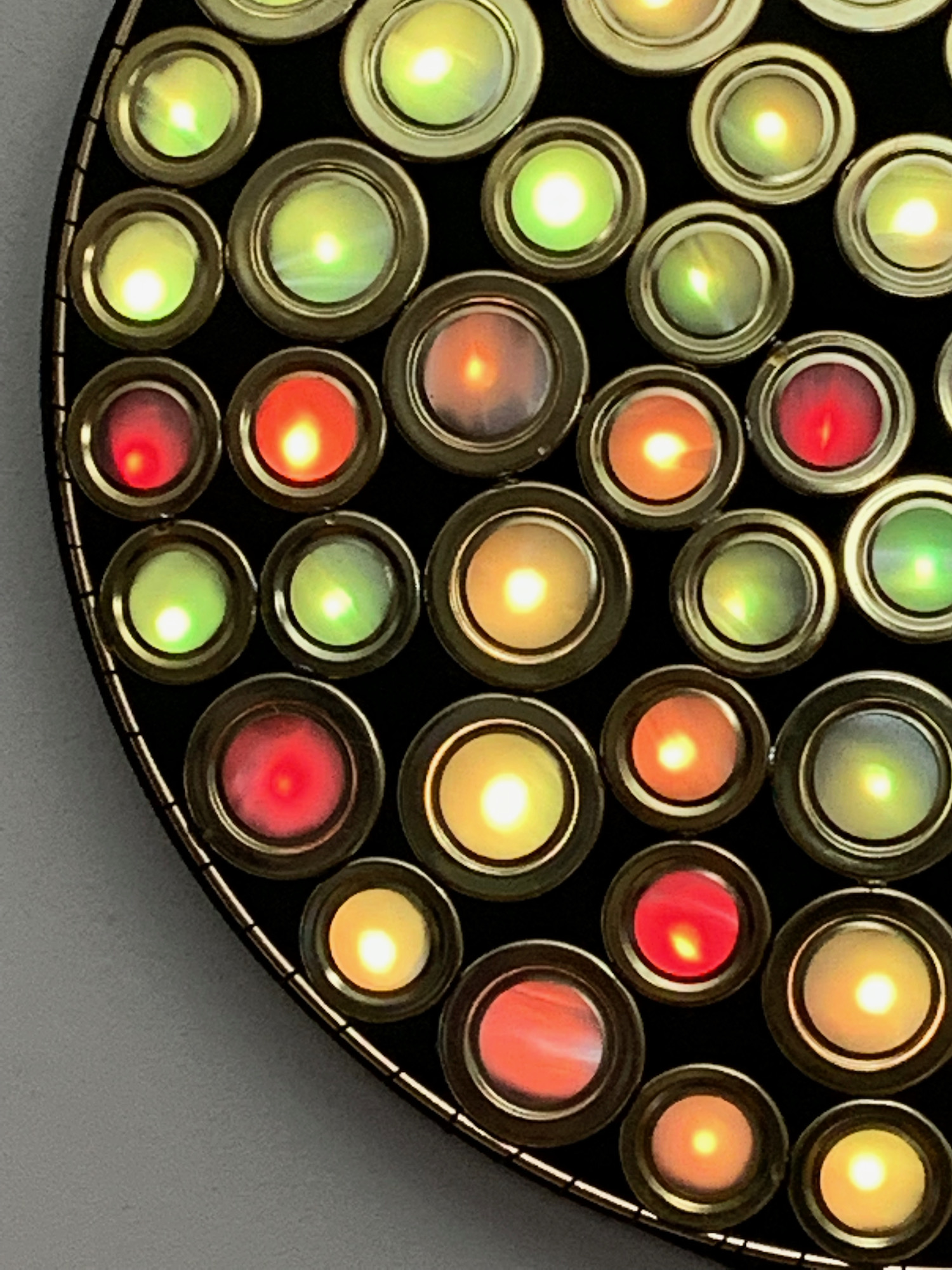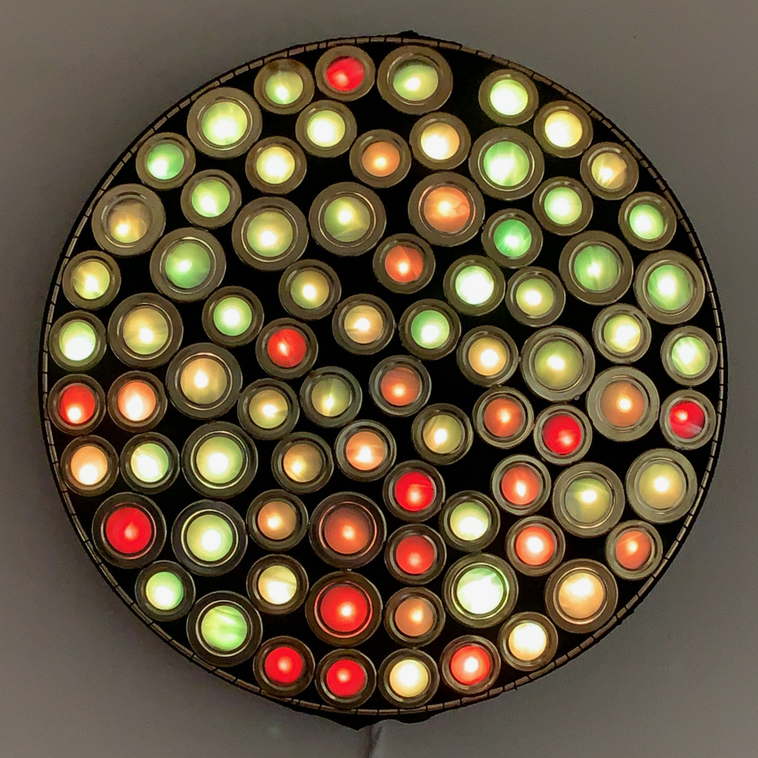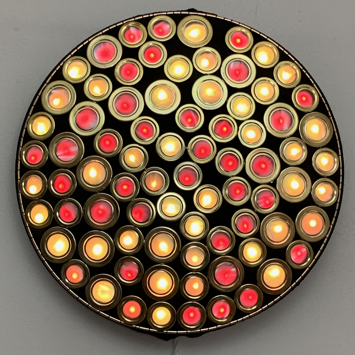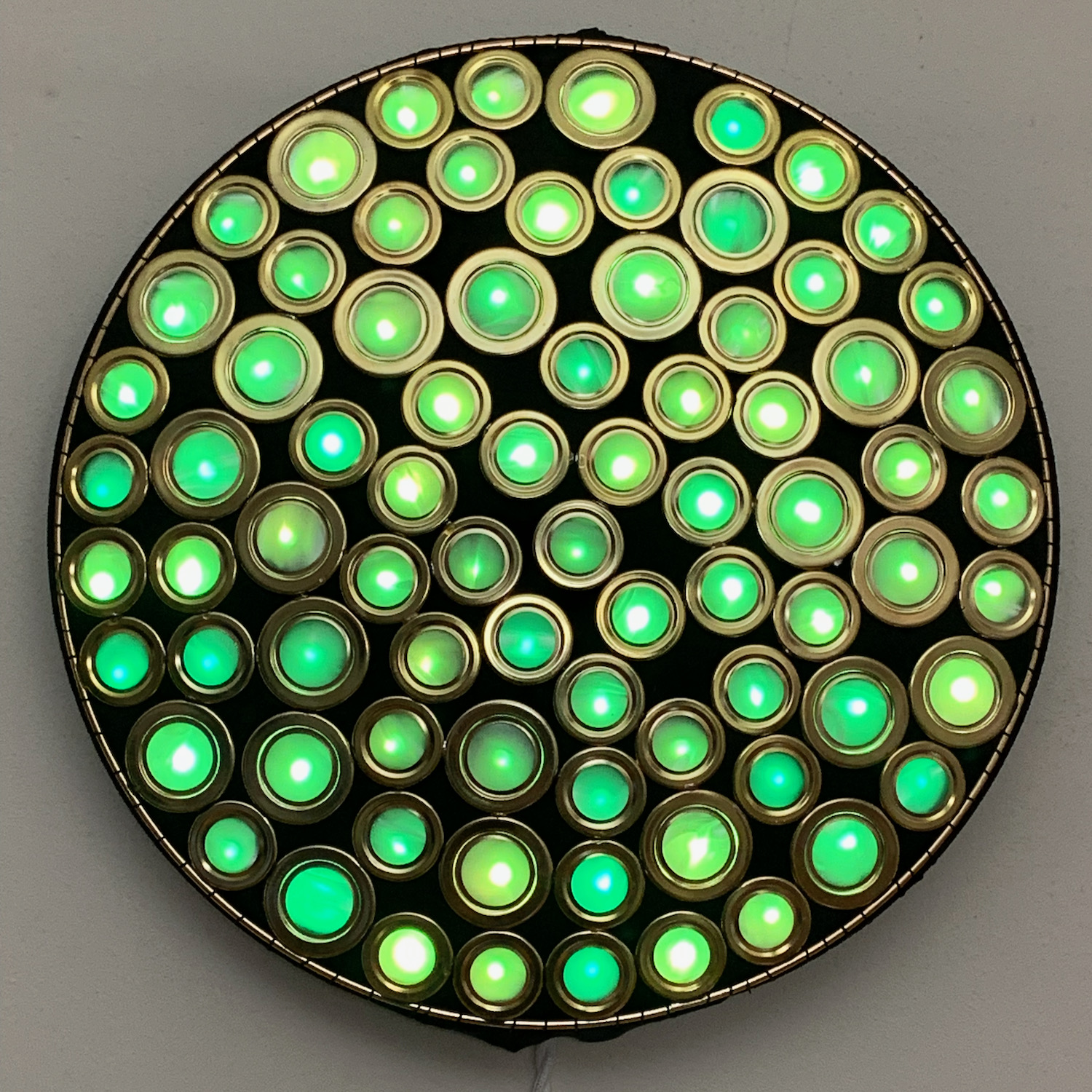 This piece is made of soldered metal brass-colored rings arranged to fill a circle. The rings are arranged in a semi-regular packing pattern, with black neoprene filling in the gaps between them. Each ring is fitted with a lenticular vinyl lens which distorts and diffuses the light from the RGB LED pixel mounted behind it.