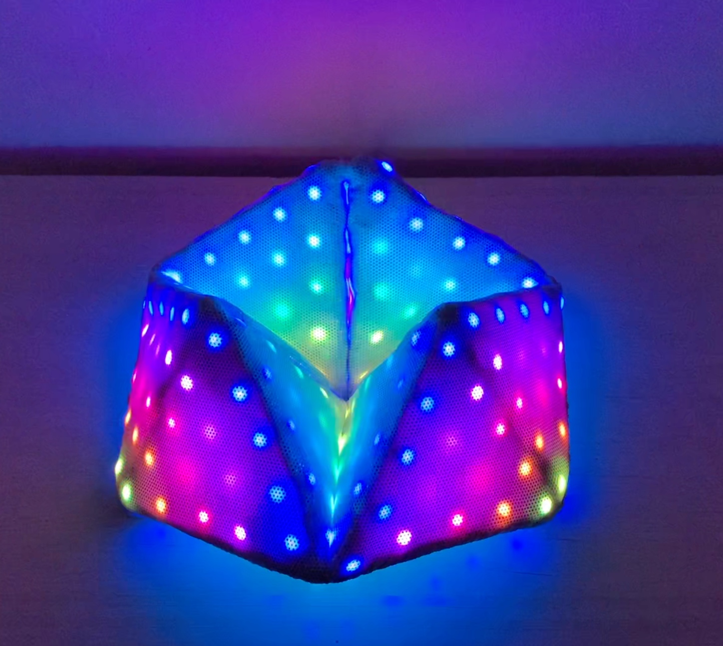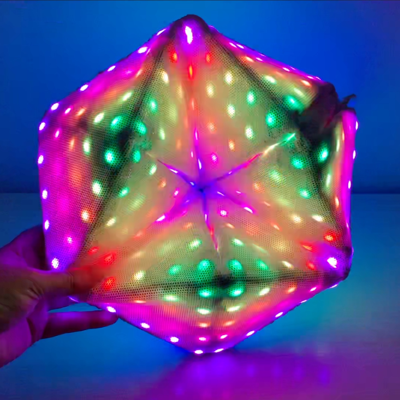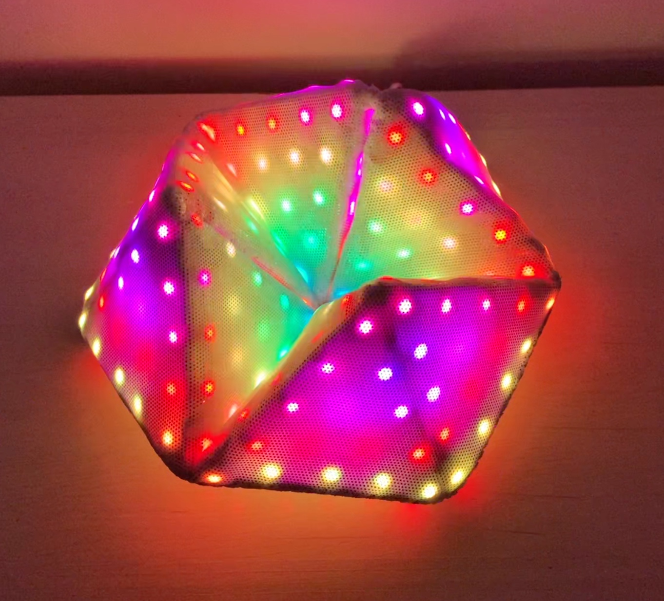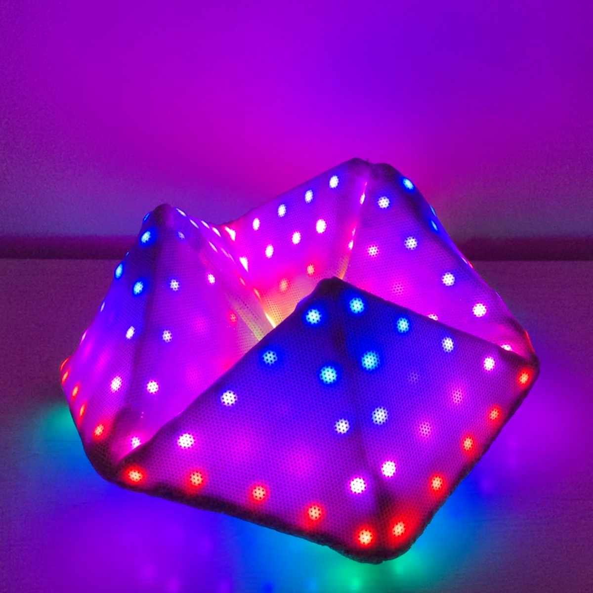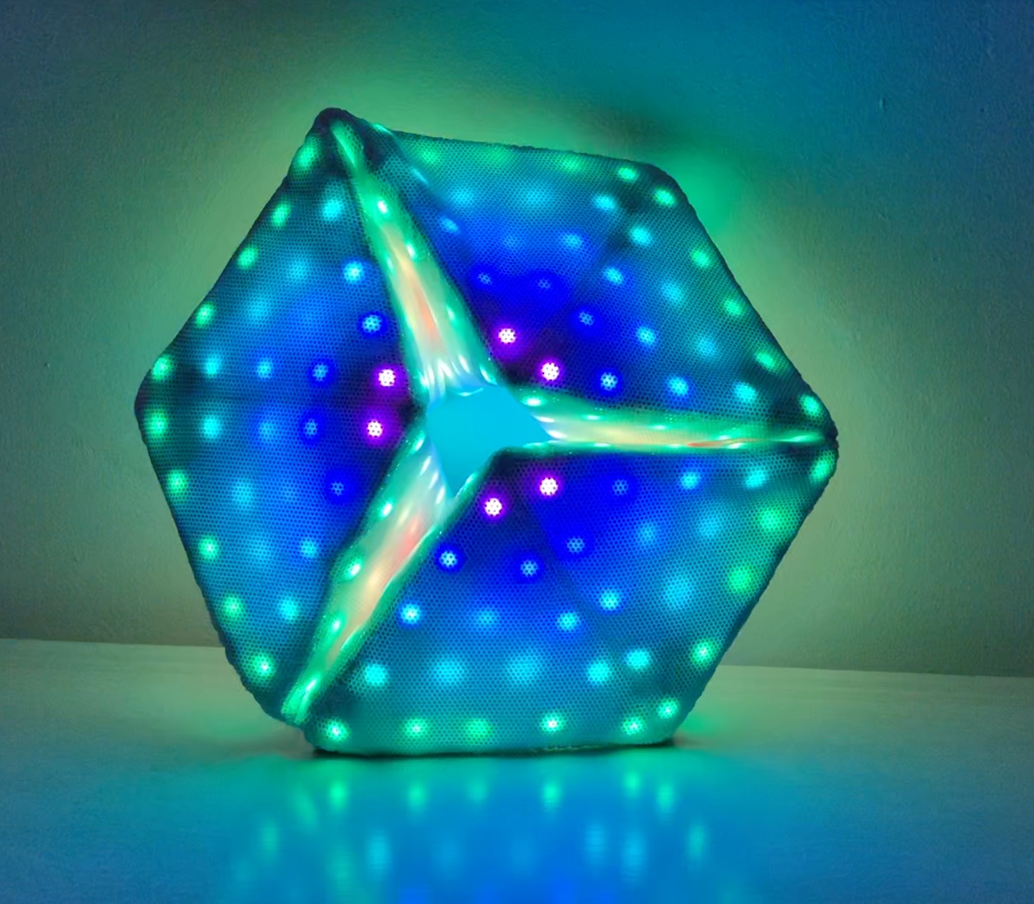 The piece contains repeating triangular segments that are illuminated in a variety of twinkling patterns and effects, including some that activate the LEDs individually, and others that highlight the geometric symmetry. Many of the animation patterns are also sound reactive.